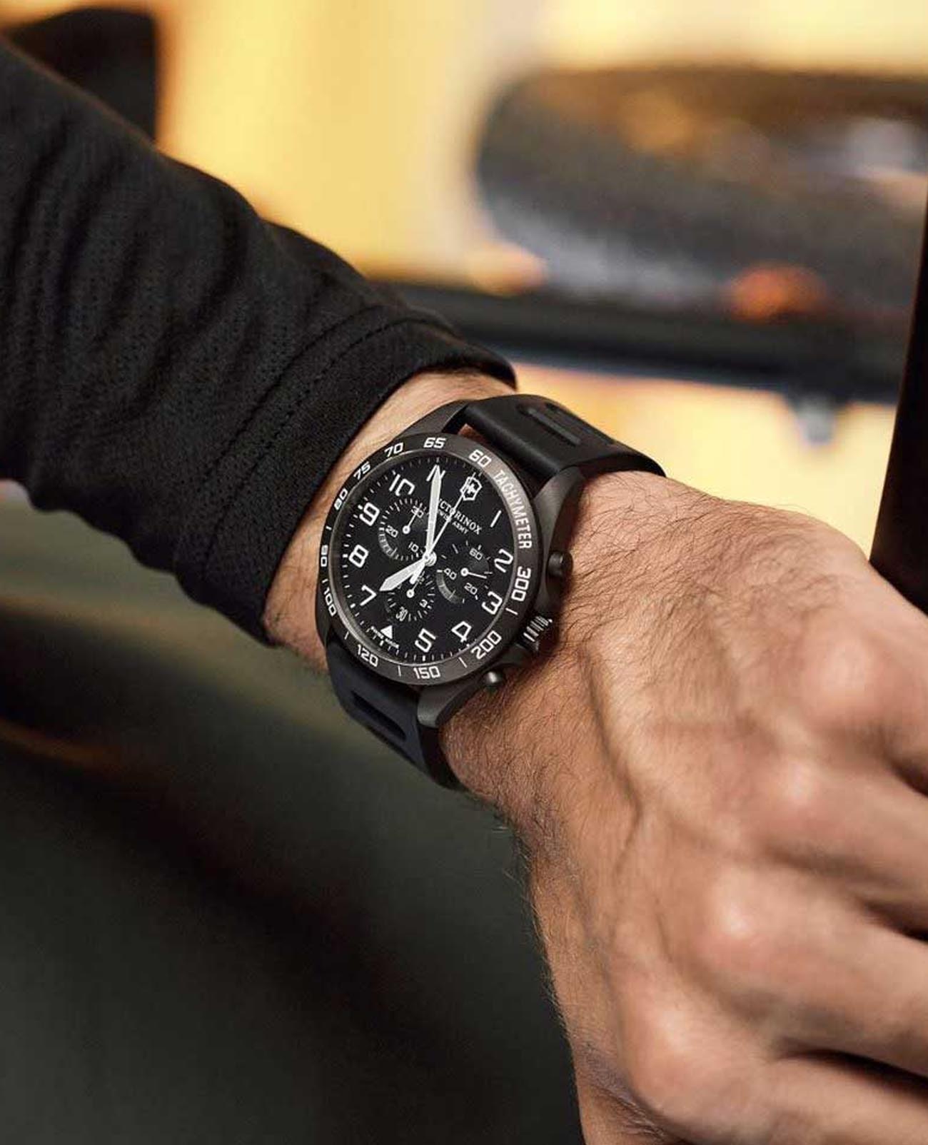 Мужские швейцарские часы-хронографХронографФункция позволяет измерять отрезки времени с особой точностью: часы, минуты, секунды. Верным признаком хронографа является наличие на циферблате 3 дополнительных окошек-счётчиков. Victorinox Fieldforce Sport Chronograph 241926.1 с надёжным кварцевым механизмом. Сапфировое стеклоСапфировое стеклоПрочный и надёжный материал из кристалла сапфира синтетического происхождения, характеризующийся особой твёрдостью и устойчивостью к царапинам и повреждениям. с трёхслойным антибликовым покрытием. Корпус часов выполнен из нержавеющей стали 316L. Практичный резиновый ремешок на стандартной застёжке. Влагозащита: 100 метров, позволит плавать, нырять и заниматься другими водными видами спорта. Окошко даты находится в положении 6 часов, стрелки и метки с люминесцентным покрытиемЛюминесцентное покрытиеПозволяет считывать показания времени в темноте. Производители наносят на стрелки, часовые индексы, безель или поверхность циферблата светонакопительный состав, дающий холодное свечение., тахиметрТахиметрРазмеченная шкала, располагается на ободке или безеле часов. Тахиметр позволяет рассчитать скорость на определённом участке пути, расстояние измеряется в километрах или милях.. В комплект вместе часами входит швейцарский нож Victorinox Spartan PS!