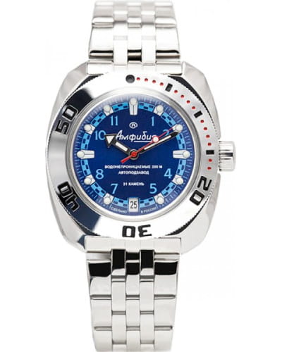 Эти практичные часы великолепно сидят на руке и позволят вам чувствовать себя уверенно в любой обстановке. Амфибия Классика. В механизме 31 камень, частота 19800 полуколебаний в час. Запас хода 31 час. Противоударное устройство оси баланса. Браслет с раскладывающейся застежкой.