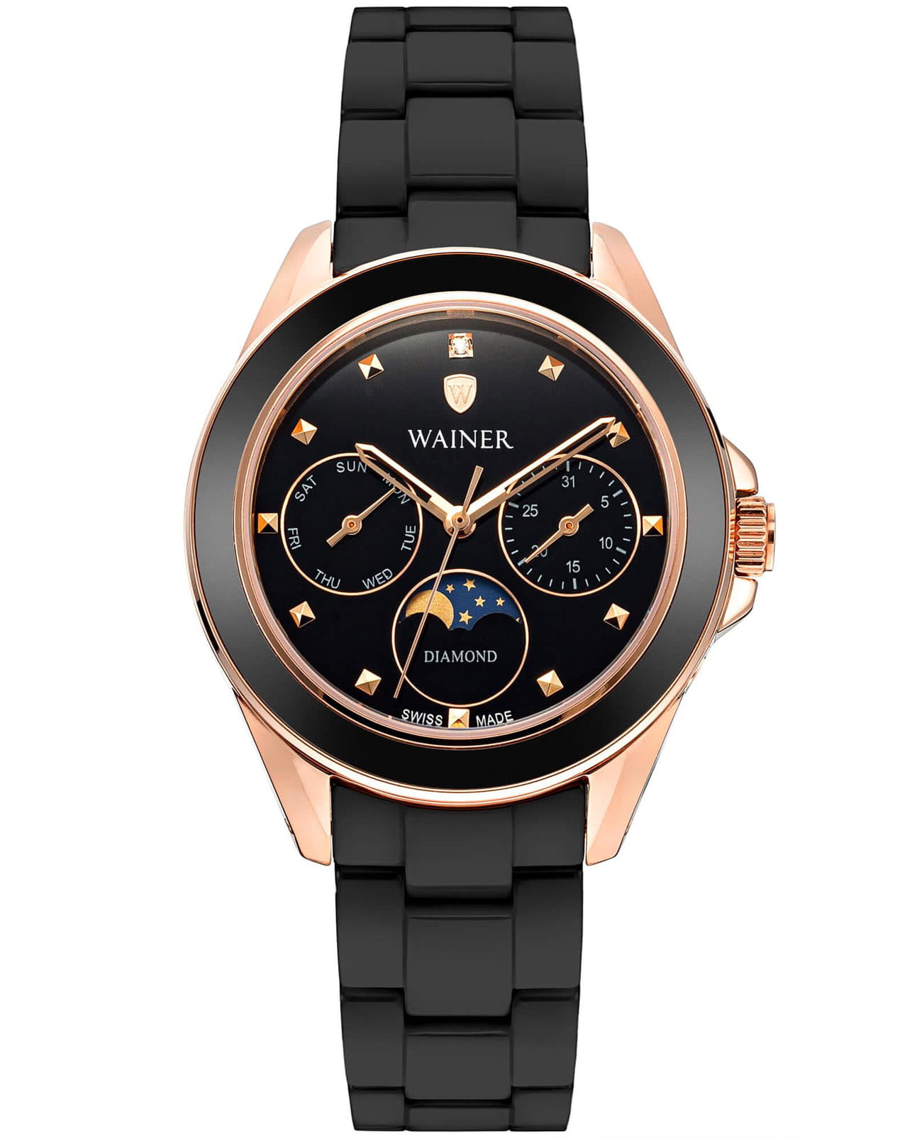 Wainer WA.18040-E – элегантные женские швейцарские часы, сочетающие изысканный стиль и высококачественные материалы. Корпус и браслет выполнен из нержавеющей стали 316L с PVD-покрытиемPVDУльтратонкое покрытие наносится в технике вакуумного напыления, сочетает в себе нитрид титана особой прочности со слоем золота или оксида хрома. Несёт в себе декоративную или защитную функцию., обеспечивающей прочность и долговечность. Сапфировое стеклоСапфировое стеклоПрочный и надёжный материал из кристалла сапфира синтетического происхождения, характеризующийся особой твёрдостью и устойчивостью к царапинам и повреждениям. с кристально чистым покрытием защищает циферблат от царапин и гарантирует идеальную прозрачность. БезельБезельВнешний ободок, закрепляющий стекло. В спортивных часах так называется поворотное кольцо с делениями на циферблате, выполняет роль таймера – замеряет отрезки времени на шкале. Неподвижный безель – элемент декора. Однонаправленно вращающийся безель на дайверских часах позволяет фиксировать моменты погружения и выныривания на поверхность. с PVD-покрытиемPVDУльтратонкое покрытие наносится в технике вакуумного напыления, сочетает в себе нитрид титана особой прочности со слоем золота или оксида хрома. Несёт в себе декоративную или защитную функцию.. Функциональность дополняется индикатором даты для удобства. Водонепроницаемость 50 метров делает модель подходящей для повседневного ношения и лёгких водных активностей.