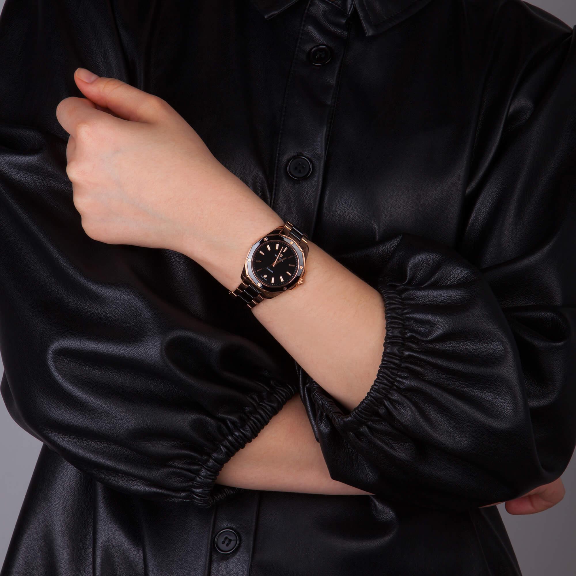 Wainer WA.18050-D – элегантные женские швейцарские часы, сочетающие изысканный стиль и высококачественные материалы. Корпус и браслет выполнен из нержавеющей стали 316L с PVD-покрытиемPVDУльтратонкое покрытие наносится в технике вакуумного напыления, сочетает в себе нитрид титана особой прочности со слоем золота или оксида хрома. Несёт в себе декоративную или защитную функцию., обеспечивающей прочность и долговечность. Сапфировое стеклоСапфировое стеклоПрочный и надёжный материал из кристалла сапфира синтетического происхождения, характеризующийся особой твёрдостью и устойчивостью к царапинам и повреждениям. с кристально чистым покрытием защищает циферблат от царапин и гарантирует идеальную прозрачность. БезельБезельВнешний ободок, закрепляющий стекло. В спортивных часах так называется поворотное кольцо с делениями на циферблате, выполняет роль таймера – замеряет отрезки времени на шкале. Неподвижный безель – элемент декора. Однонаправленно вращающийся безель на дайверских часах позволяет фиксировать моменты погружения и выныривания на поверхность. с PVD-покрытиемPVDУльтратонкое покрытие наносится в технике вакуумного напыления, сочетает в себе нитрид титана особой прочности со слоем золота или оксида хрома. Несёт в себе декоративную или защитную функцию.. Водонепроницаемость 50 метров делает модель подходящей для повседневного ношения и лёгких водных активностей.