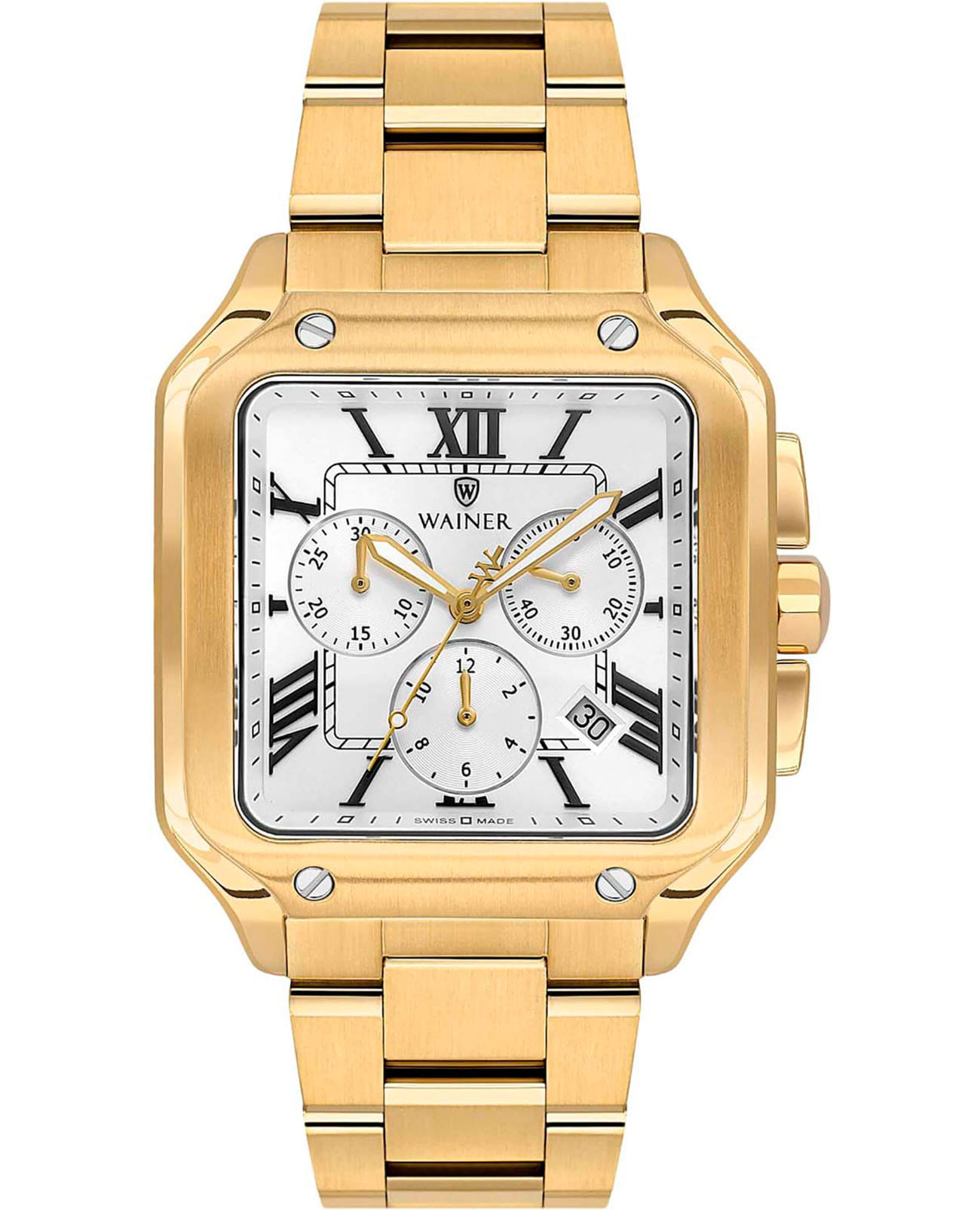 Мужские кварцевые часы Wainer WA.18090-G — это стильный аксессуар, сочетающий в себе швейцарское качество и изысканный дизайн. Модель выполнена в квадратной форме из стали 316L с PVD-покрытиемPVDУльтратонкое покрытие наносится в технике вакуумного напыления, сочетает в себе нитрид титана особой прочности со слоем золота или оксида хрома. Несёт в себе декоративную или защитную функцию., что придаёт ей благородный внешний вид и устойчивость к царапинам. Корпус украшен декоративными винтами, подчёркивая внимание к деталям. Циферблат белого цвета выполнен по технологии , создающей эффект солнечных лучей, а его поверхность дополнена штриховыми метками и римскими цифрами. Секундная стрелка на конце декорирована буквой W, добавляя модели индивидуальности. Защиту механизма обеспечивает сапфировое стеклоСапфировое стеклоПрочный и надёжный материал из кристалла сапфира синтетического происхождения, характеризующийся особой твёрдостью и устойчивостью к царапинам и повреждениям., устойчивое к повреждениям. Окошко даты расположено в положении 4 часов, а гранёная заводная головка с защитой оснащена фирменным логотипом. Браслет из стали 316L с PVD-покрытием шириной 22 мм оснащён Раскладная застёжкаРаскладная застёжкаТакой тип застёжки используется только на браслетах из металла. Она никогда не раскрывается полностью, происходит разделение на 2 и более частей. Раскладывающая застёжка снизит вероятность потери часов к минимуму., обеспечивающей комфорт и надёжную фиксацию на запястье. Водонепроницаемость позволяет использовать модель при мытье рук или под лёгким дождём. Стрелки с люминесцентным покрытиемЛюминесцентное покрытиеПозволяет считывать показания времени в темноте. Производители наносят на стрелки, часовые индексы, безель или поверхность циферблата светонакопительный состав, дающий холодное свечение. обеспечивают отличную читаемость даже в условиях слабого освещения. Механизм калибра Ronda 5030.D гарантирует точность хода и надёжность. Эти часы станут универсальным аксессуаром для тех, кто ценит сочетание стиля, функциональности и швейцарского мастерства — идеальный выбор для повседневной носки и торжественных случаев.