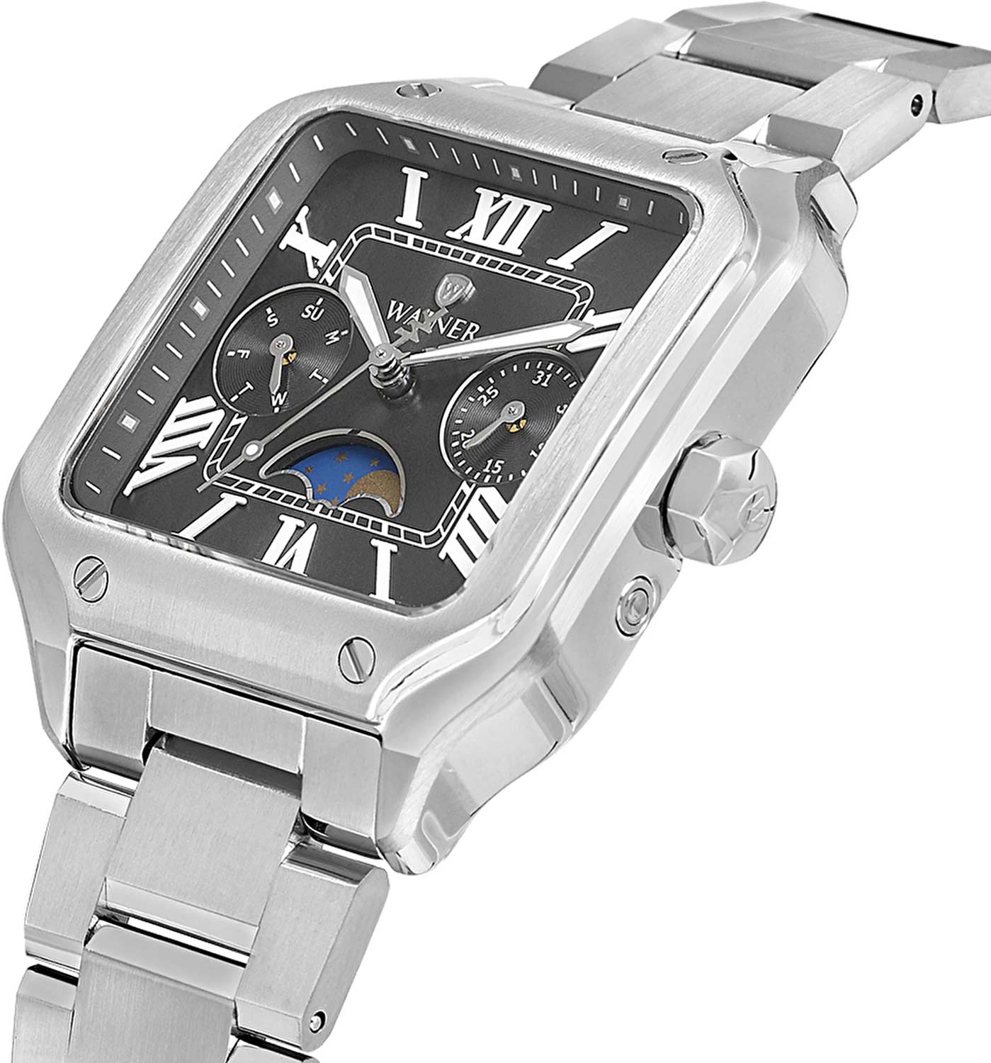 Женские кварцевые часы Wainer WA.18091-D — это стильный аксессуар, сочетающий в себе швейцарское качество и изысканный дизайн. Модель выполнена в квадратной форме из стали 316L с декоративными винтами, что придаёт ей прочность и устойчивость к царапинам. Циферблат дополнен штриховыми метками и римскими цифрами, а секундная стрелка на конце декорирована буквой W, подчёркивая внимание к деталям. Число, день недели и индикатор фазы Луны вынесены на отдельные циферблаты, что делает модель функциональной и выразительной. Защиту механизма обеспечивает сапфировое стеклоСапфировое стеклоПрочный и надёжный материал из кристалла сапфира синтетического происхождения, характеризующийся особой твёрдостью и устойчивостью к царапинам и повреждениям., устойчивое к повреждениям. Гранёная заводная головка с защитой оснащена фирменным логотипом, добавляя модели индивидуальности. Браслет из стали 316L шириной 16 мм оснащён Раскладная застёжкаРаскладная застёжкаТакой тип застёжки используется только на браслетах из металла. Она никогда не раскрывается полностью, происходит разделение на 2 и более частей. Раскладывающая застёжка снизит вероятность потери часов к минимуму., обеспечивающей комфорт и надёжную фиксацию на запястье. Водонепроницаемость позволяет использовать модель при мытье рук или под лёгким дождём. Стрелки с люминесцентным покрытиемЛюминесцентное покрытиеПозволяет считывать показания времени в темноте. Производители наносят на стрелки, часовые индексы, безель или поверхность циферблата светонакопительный состав, дающий холодное свечение. обеспечивают отличную читаемость даже в условиях слабого освещения. Механизм калибра Ronda 706.1 гарантирует точность хода и надёжность. Эти часы станут универсальным аксессуаром для тех, кто ценит сочетание стиля, функциональности и швейцарского мастерства — идеальный выбор для повседневной носки и торжественных случаев.